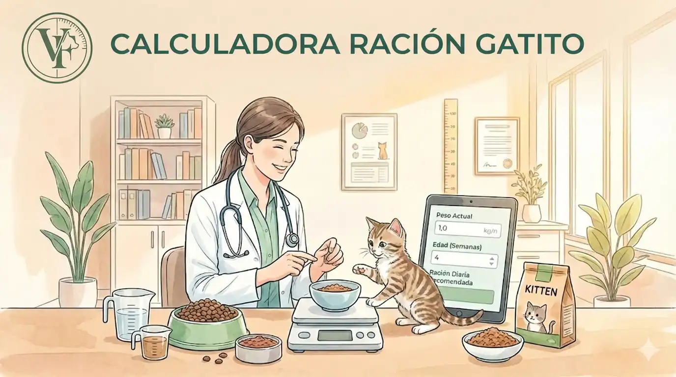 Introduce la edad y el peso actual. El resultado muestra un rango orientativo para evitar falsa precisión. Usa alimento formulado para gatitos y ajusta según apetito, heces y crecimiento.